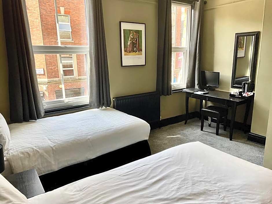 This twin room contains amenities such as complimentary tea and coffee, a flat-screen TV with Freeview channels, and a desk.